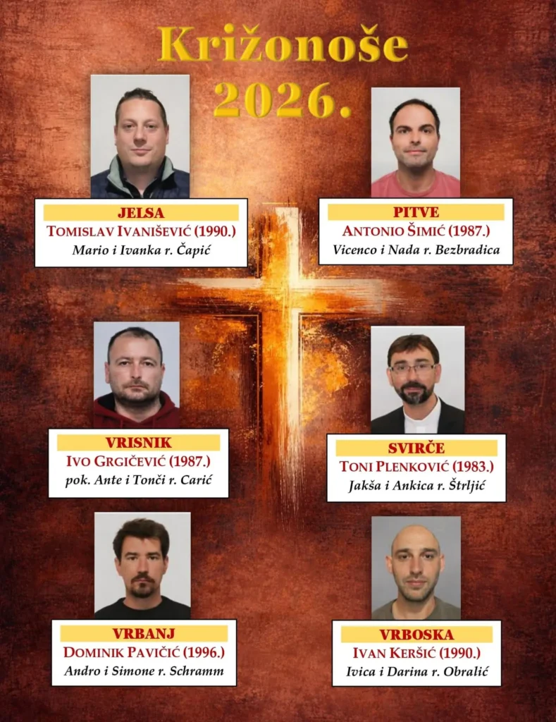 Križonoše koji će 2026. godine predvoditi tradicionalnu procesiju ”Za križen” na otoku Hvaru u 2026.godini su: